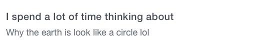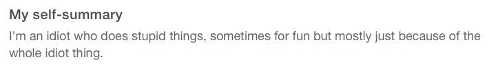 I kept my profile fairly brief at first, until I had a rummage around the site to get a feel for what people were saying. Much like the photos, some people were trying too hard. Conversely, some people weren’t trying at all. My rule of thumb was if I couldn’t think of anything I thought was witty enough for a section, I would leave it blank. Others should have perhaps followed this advice: